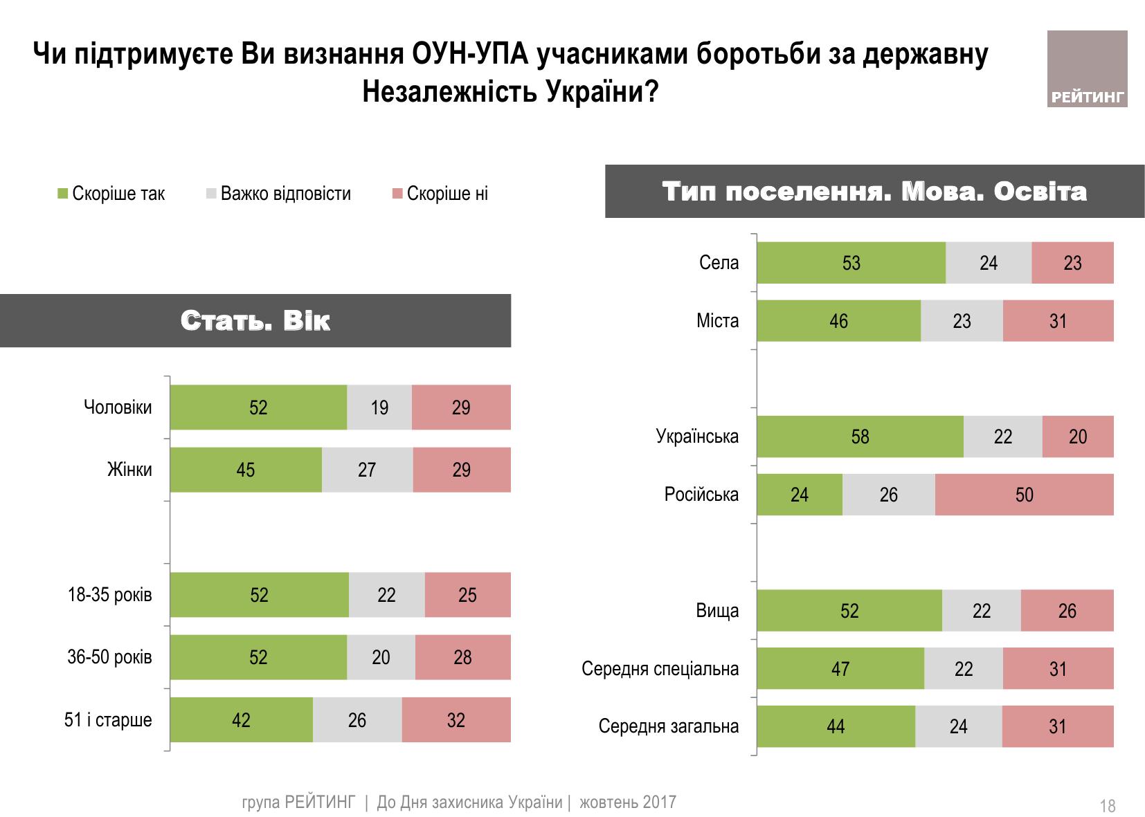 На Заході підтримка цієї ідеї найбільша - 80%. Половина респондентів у Центрі також підтримують визнання ОУН і УПА. У той же час майже половина мешканців Сходу і Півдня не підтримують ідею визнання національно-повстанського руху.