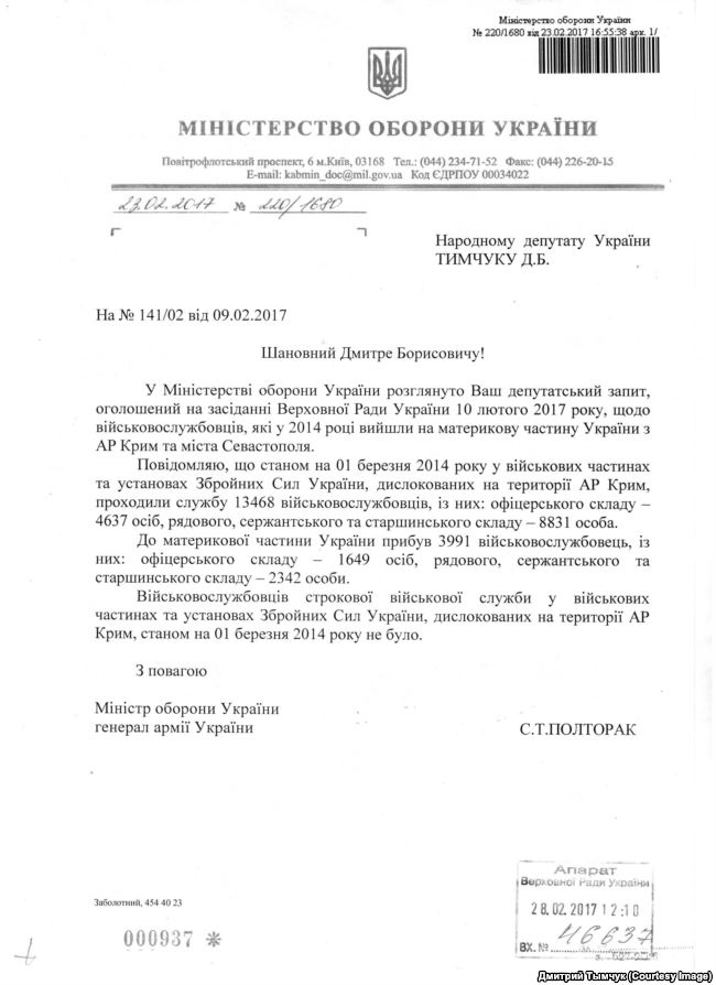 "Повідомляємо, що на 1 березня 2014 у військових частинах і установах Збройних сил України, дислокованих на території АР Крим, проходили службу 13 468 військовослужбовців, з них: офіцерського складу – 4637 осіб, рядового, сержантського і старшинського складу – 8831 людина. До материкової частини України прибув 3991 військовослужбовець, з них: офіцерського складу – 1649 осіб, рядового, сержантського і старшинського складу – 2342 людини", – наголошується в документі.
