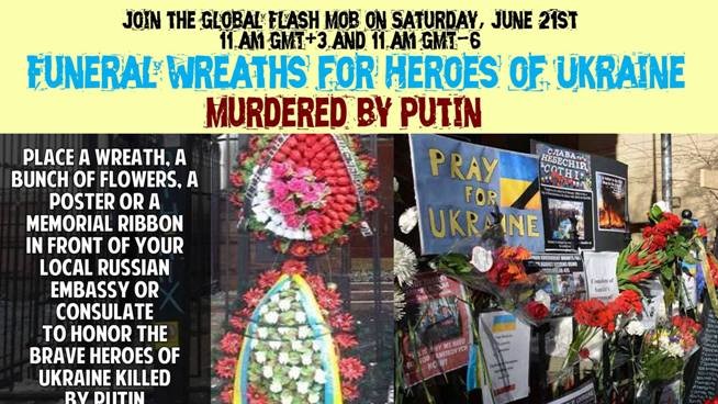 У суботу, 21 червня, у багатьох країнах світу розпочався глобальний флешмоб проти агресії Кремля щодо України. Активісти приносять в посольства і консульства РФ, а також до постійного представництва Росії в ООН у Нью-Йорку похоронні вінки, щоб вшанувати жертв путінської агресії проти України.