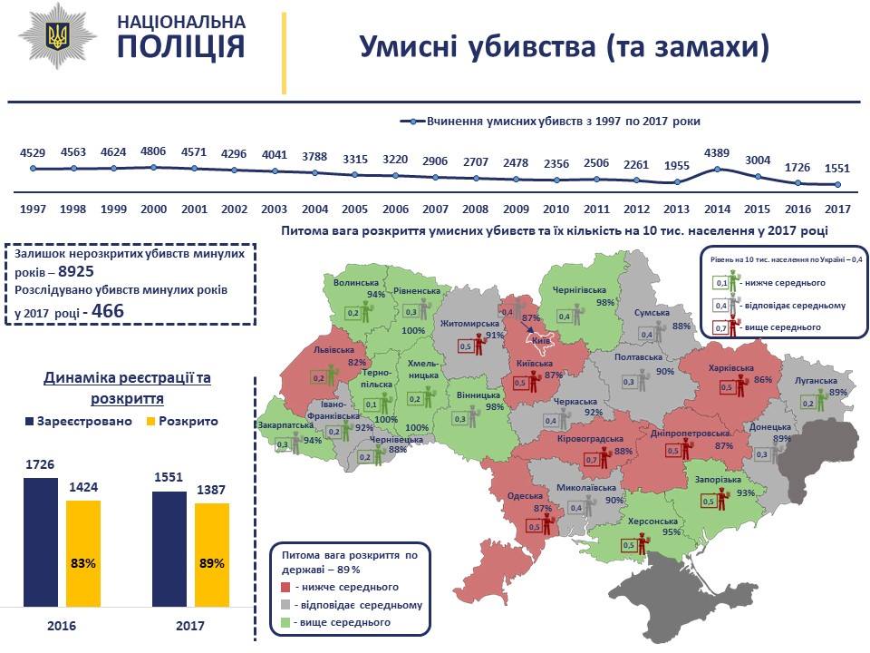 Заступник голови Нацполіції на своїй сторінці в Facebook навів дані щодо скоєння та розкриття в країні навмисних вбивств протягом останніх 20 років: