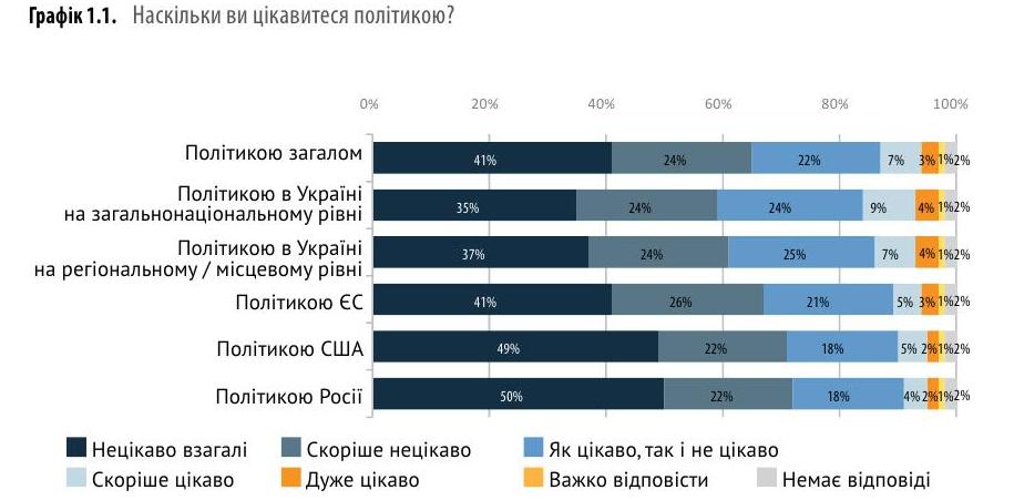 Українська молодь у віці 14-29 років здебільшого не цікавиться політикою. Найцікавішою для української молоді є політика України на загальнонаціональному рівні: тих, кому дуже цікаво та скоріше цікаво - 13% від усіх опитаних, свідчать дані дослідження, реалізованого Центром "Нова Європа" та Фондом ім.Фрідріха Еберта спільно з компанією GfK Ukraine.