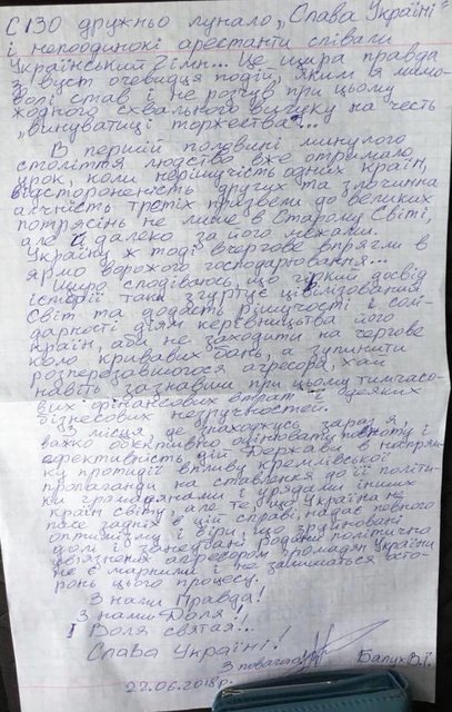 У листі, зокрема, Балух розповів, що 12 червня, коли у РФ відзначали "День Росії", з сімферопольського СІЗО лунали крики "Слава Україні!" і ув'язнені дружно і голосно співали український гімн.