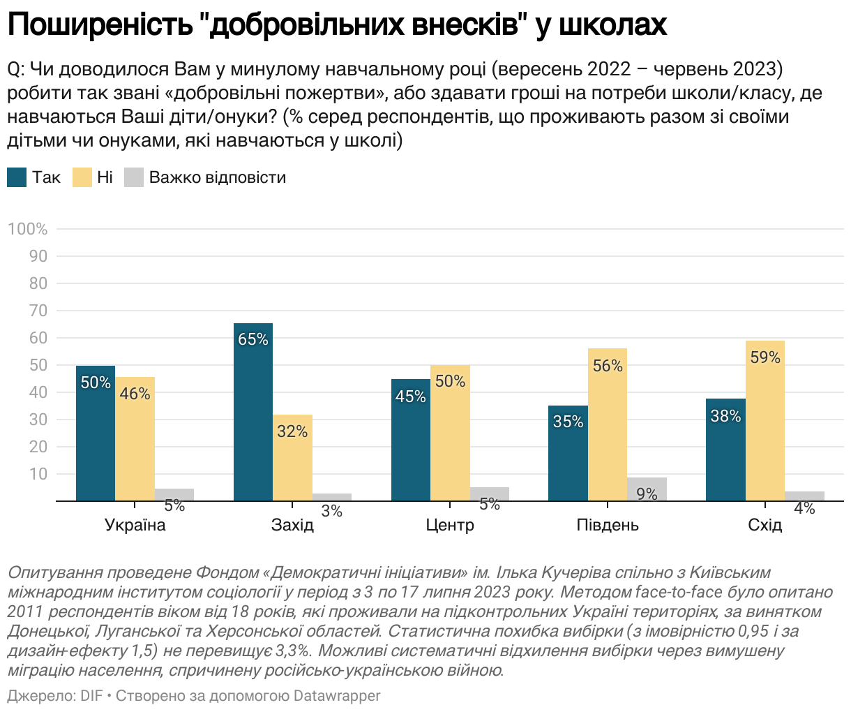 У минулому навчальному році половині опікунів доводилося робити так звані «добровільні пожертви», або здавати гроші на потреби школи чи класу. Водночас близько 46% респондентів в Україні не стикалися з такою практикою.