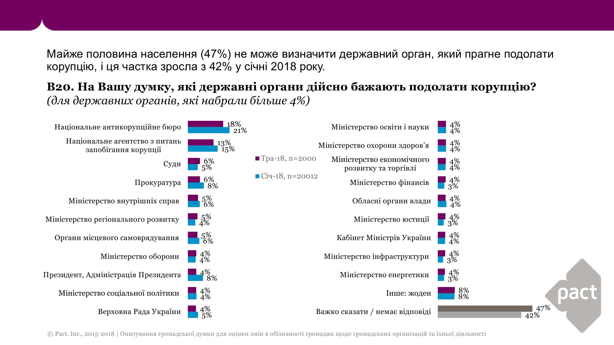Найчастіше українці називали Національне антикорупційне бюро (18%), Національне агентство з питань запобігання корупції (13%). Про суди, прокуратуру та Міністерство внутрішніх справ згадали 5-6% опитаних.