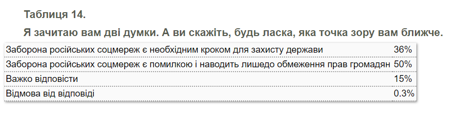 Згідно з результатами опитування, 36% громадян вважають, що заборона російських соціальних мереж - це необхідний крок для захисту держави. При цьому 50% українців заявили про те, що така заборона є помилкою і призводить лише до обмеження прав громадян.