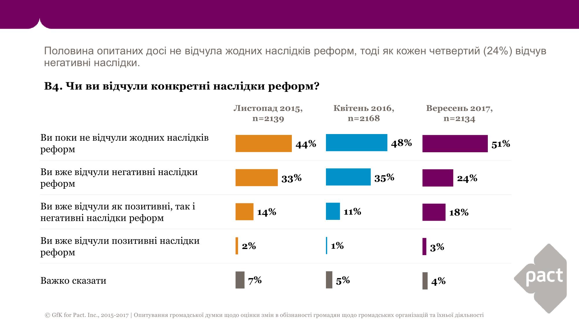 Половина українців (51%) досі не відчули жодних наслідків реформ, тоді як кожен четвертий (24%) відчув негативні наслідки, свідчать дані опитування GfK Ukraine на замовлення організації Pact.