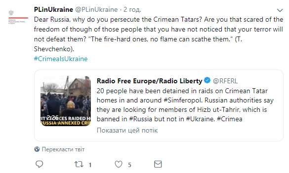 Посольство Польщі в Україні підтримало затриманих російськими окупантами кримськотатарських активістів, заявивши, що Росії не вдасться терором зломити вільнодумство кримськотатарського народу; про це польські дипломати написали у Twitter посольства.