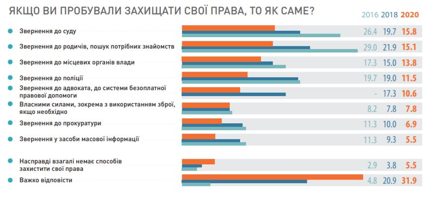 Якщо говорити про способи, якими українці намагалися захистити свої права, то 16% зверталися до суду, а 15% - до родичів або шукали потрібні знайомства. Ще 14% респондентів зверталися до місцевих органів влади, а 12% - до поліції. До адвокатів чи системи безоплатної правової допомоги для захисту своїх прав зверталися 11% опитаних.