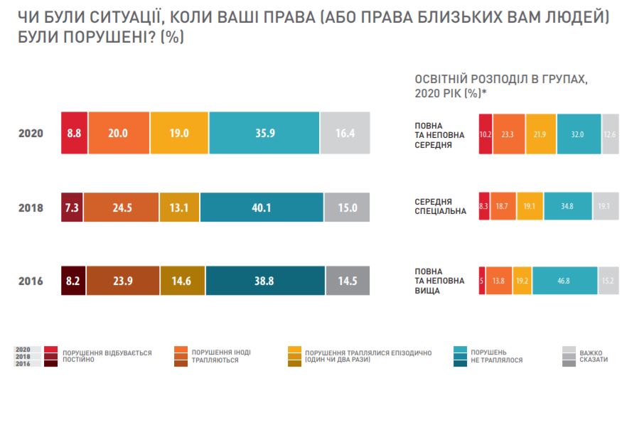 Про те, що постійно стикаються з порушенням своїх прав зазначили 9% респондентів. Ще 20% говорять про те, що таке іноді трапляється. Про те, що їхні права порушували раз чи два рази, розповіли 19% громадян.