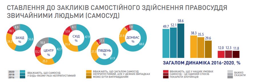 При цьому 60% громадян переконані, що самосуд є неприпустимим у будь-якому випадку.