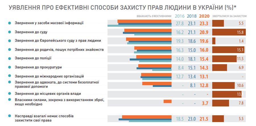 Найбільш ефективним способом захисту прав людини 23% опитаних вважають звернення до ЗМІ. Ще 21% українців вказав на звернення до суду, а 20% - до Європейського суду з прав людини. Водночас 22% респондентів переконані, що в Україні немає способів захистити свої права.