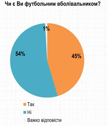 Згідно з опитуванням, проведеним до Євро-2020, серед респондентів 45% вважають себе футбольними фанами, в той же час 54% - себе до таких не зараховують. Більше фанатів футболу серед чоловіків старшого покоління проживає в західних регіонах.