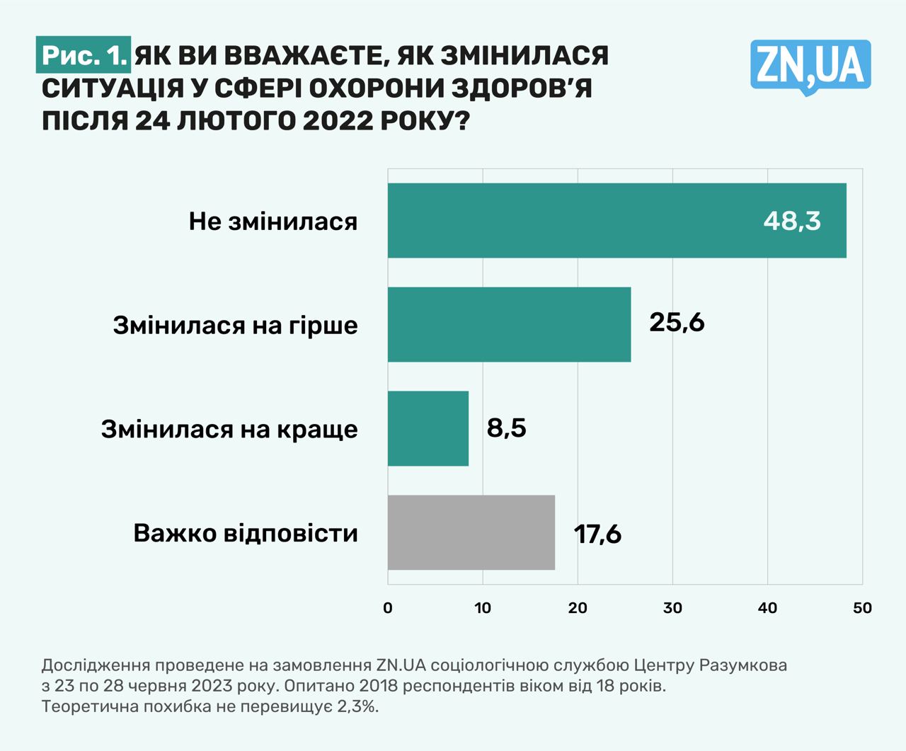 На запитання: "Як ви вважаєте, як змінилася ситуація у сфері охорони здоров’я після 24 лютого 2022 року?" відносна більшість українців (48,3%) відповіла, що "не змінилася". 25,6% переконані, що "змінилася на гірше", 17,6% не змогли відповісти. Зміни на краще побачили 8,5% громадян.