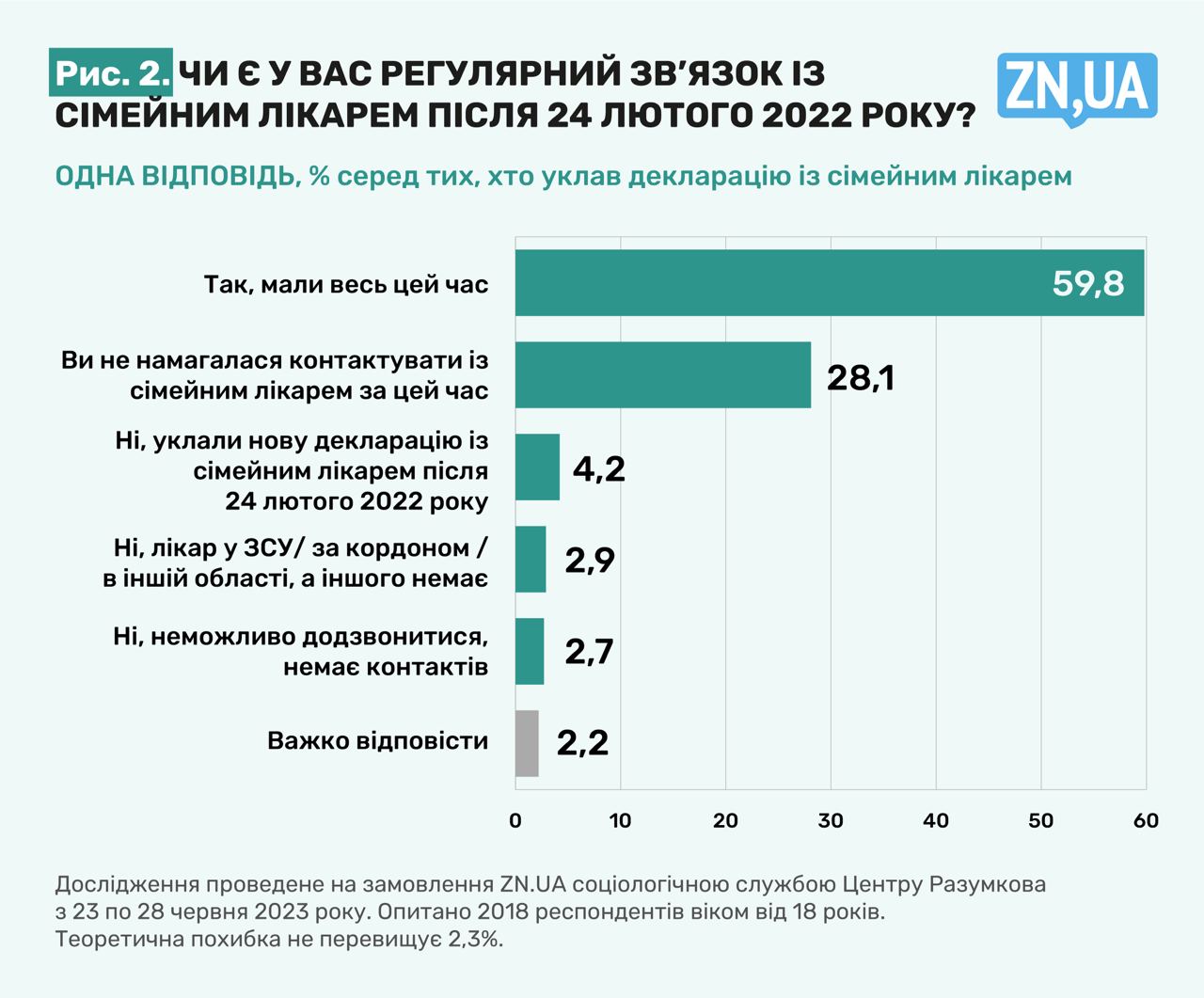 Лише 5,6% пацієнтів не змогли зв’язатися з лікарем - у 2,9% лікар "у ЗСУ/за кордоном/у іншій області, а іншого немає"; 2,7% не змогли додзвонитися або не мають контакту з лікарем. Після 24 лютого 2022 року уклали нову декларацію 4,2% опитаних. "Не намагалися контактувати із сімейним лікарем за цей час" 28,1% респондентів.