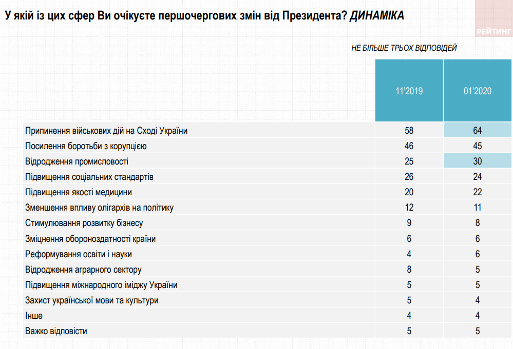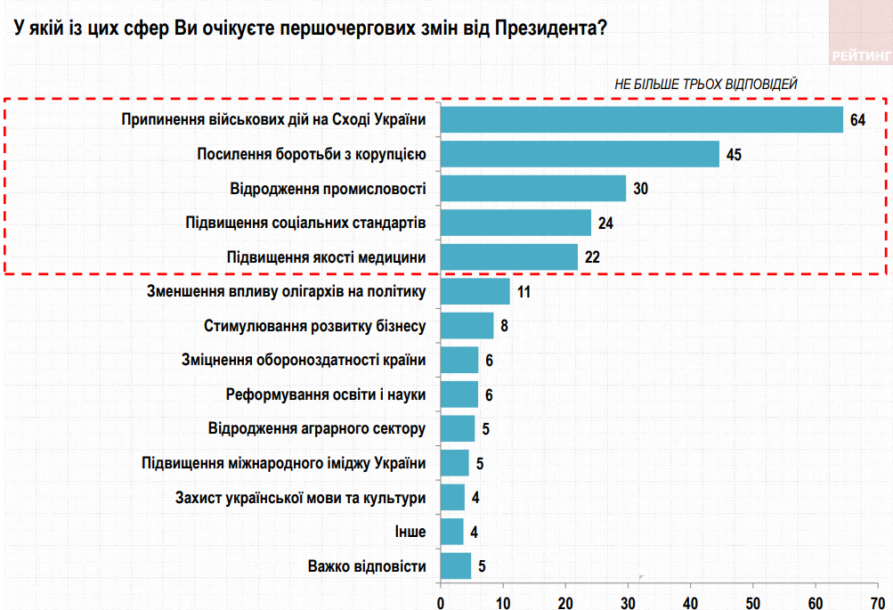 На встановлення миру на сході України чекають 64% опитаних українців. Ще 45% респондентів вважають за потрібне посилити боротьбу із корупцією, 30% - відродити вітчизняну промисловість. Значимість запитів на припинення війни та відродження промисловості зростала упродовж останніх місяців.