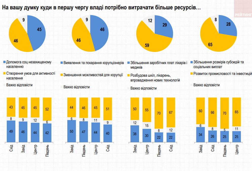 Водночас 65% респондентів вважають, що державні ресурси слід спрямувати на розвиток промисловості й інвестицій, 46% – на боротьбу з корупцією, і майже стільки ж опитаних (45%) вважають, що кошти слід спрямувати на допомогу соціально незахищеним категоріям.