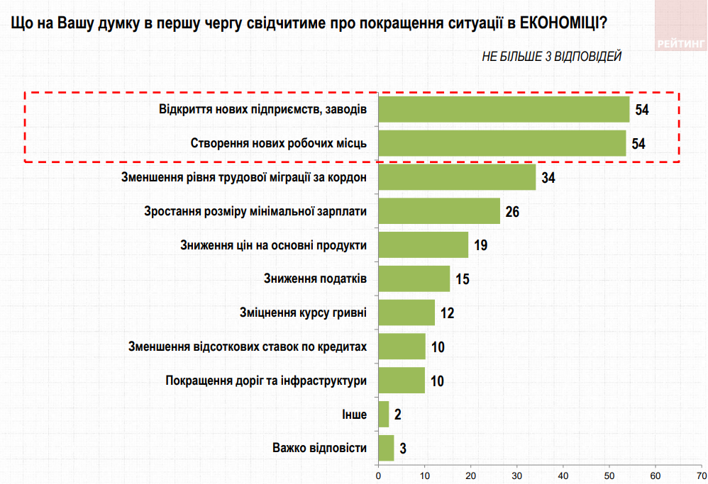 Основними маркерами позитивних змін в економіці українці вважають відкриття нових підприємств та створення нових робочих місць (54%), зменшення рівня трудової міграції, зростання розміру мінімальної зарплати та зниження цін на основні продукти.