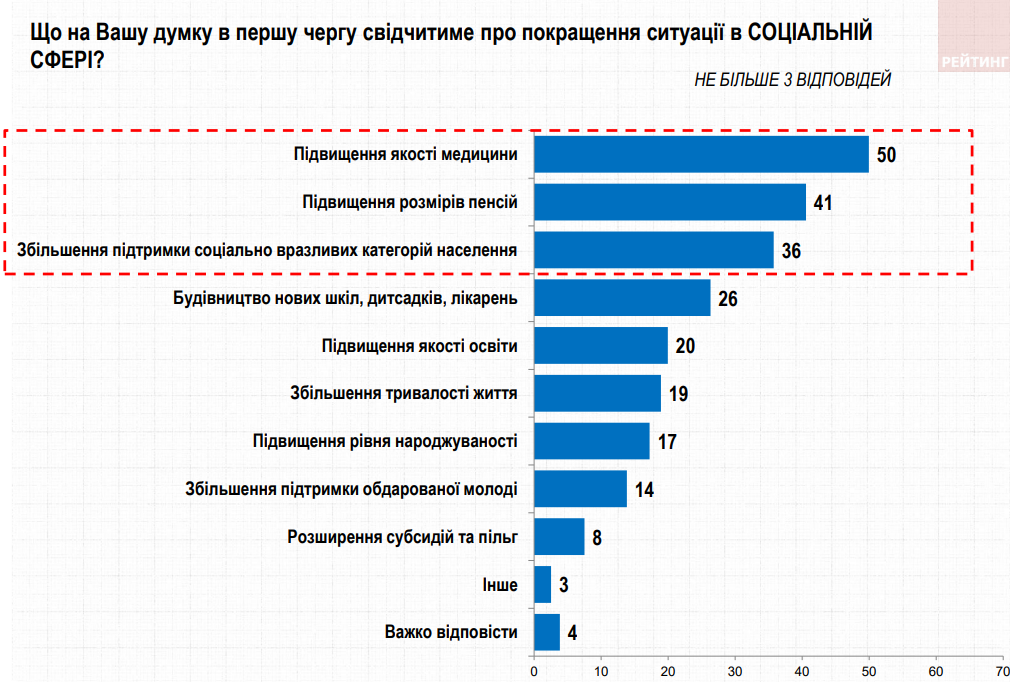 У соціальній сфері ключовими маркерами позитивних зрушень респонденти вважають підвищення якості медицини (50%), зростання розмірів пенсій (41%) та збільшення підтримки соціально вразливих категорій населення (36%).