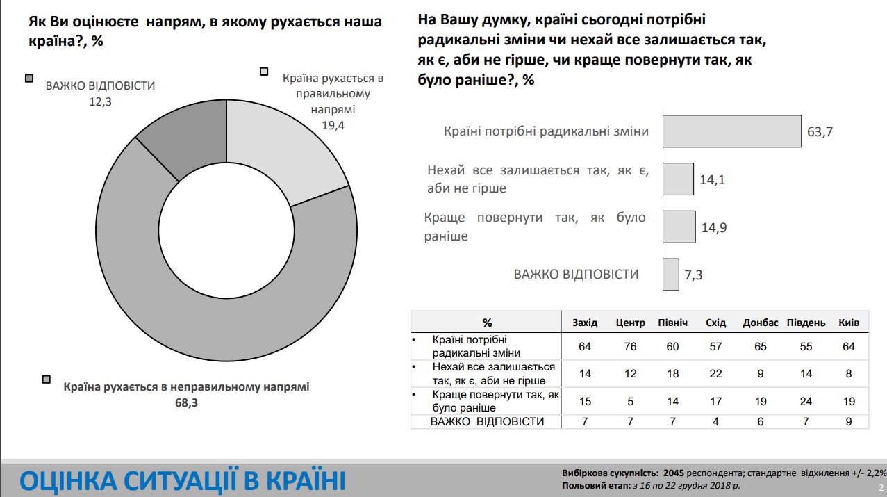 Також більшість населення вважає, що країна продовжує рухатися в неправильному напрямі, таких 68,3%, а протилежної думки дотримується лише 19,4%, ще 12,3% не визначилися.