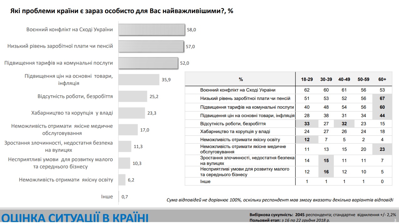 Проблемами, які сьогодні турбують українців найбільше, є військовий конфлікт на Сході України (назвали 58% опитаних); низький рівень зарплат і пенсій (57%); підвищення тарифів на комунальні послуги (52%); підвищення цін на основні товари, інфляція (35,9%); безробіття (25,2%); хабарництво та корупція у владі (23,3%).