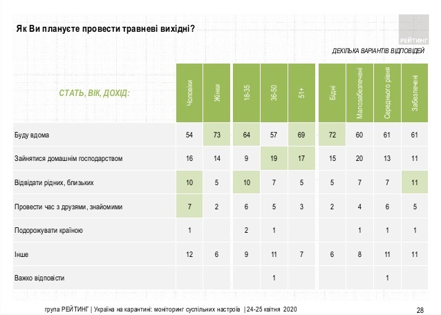 Під час травневих свят три чверті українців не планують залишати власні домівки. Про це свідчать дані дослідження соціологічної групи "Рейтинг".