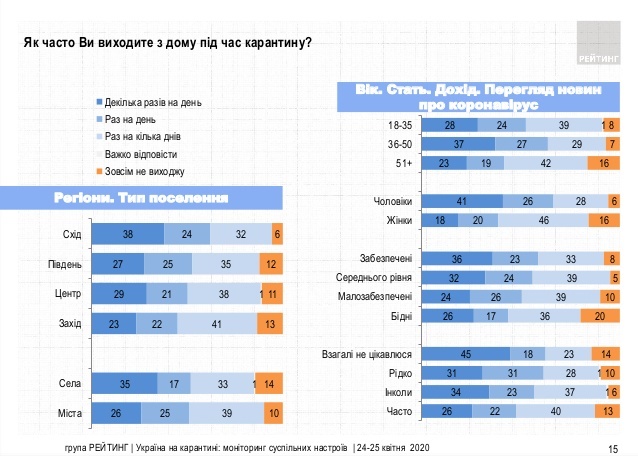 Також стало відомо, скільки разів на день українці виходять з власних помешкань. Дослідження показало, що 29% опитаних декілька разів за добу покидають власну домівку, 23% роблять це лише один раз за 24 години,а 37% й взагалі намагаються виходити з дому раз у декілька днів. 11% повідомили, що в прагненні повної самоізоляцію докладають всіх зусиль, аби взагалі не покидати домівку.
