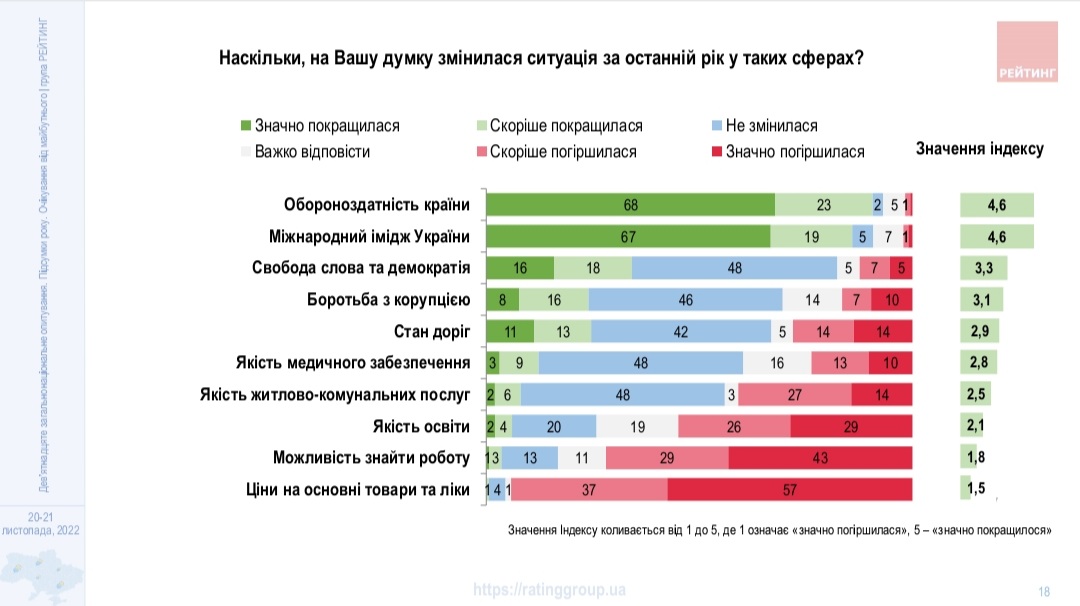 На думку українців, погіршилася ситуація в Україні за останній рік з цінами на основні товари та ліки (для 94%), можливості знайти роботу (для 72%) та якості освіти (для 55%).