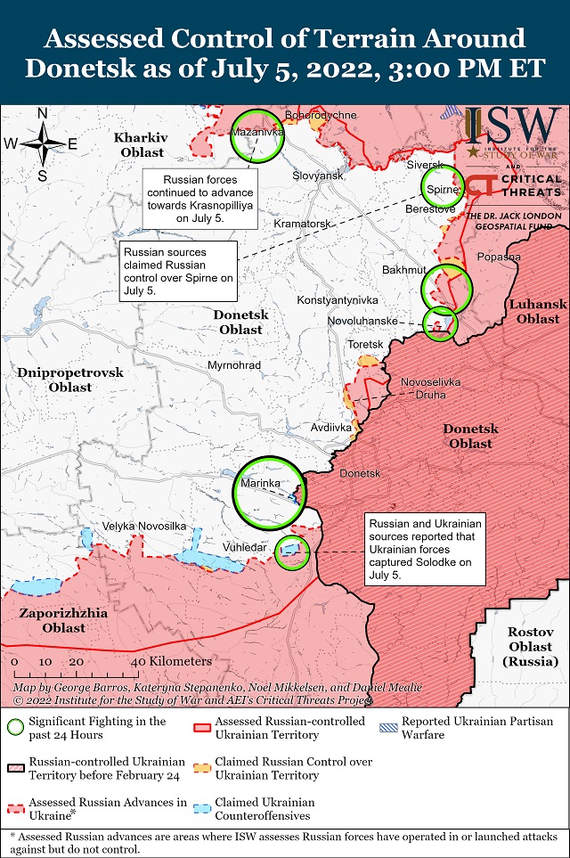 Далі аналітики інституту, опираючись на заяву речника Міноборони України Олександра Мотузяника, повідомили, що окремі підрозділи російської армії готуються до просування на Слов'янськ. Російські війська здійснили невдалі атаки на Долину та Краснопілля на північний захід від Слов’янська. Вони продовжували артилерійські удари по українських позиціях на південний схід від Ізюма вздовж траси Е40 та обстрілювали Діброве, Долину, Адамівку, Богородичне та Мазанівку. Також росіяни обстріляли Криву Луку, приблизно за 20 км на схід від Слов’янська, щоб продовжувати створювати умови для наступу на Слов’янськ з південного заходу від Лиману.