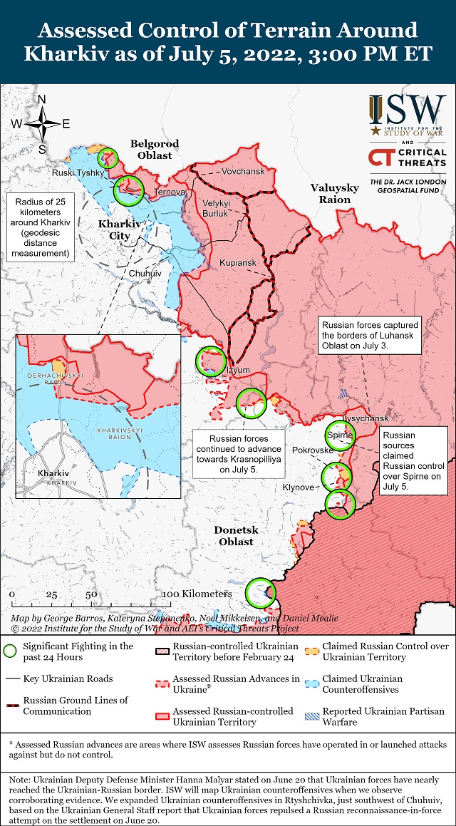 Заявленими цілями Росії під час її вторгнення в Україну залишаються зміна режиму в Києві та знищення українського суверенітету. Ці цілі не змінили навіть численні військові невдачі Росії на фронті. Про це в своєму зведенні за 5 липня повідомили аналітики Американського інституту вивчення війни (Institute for the Study of War, ISW).