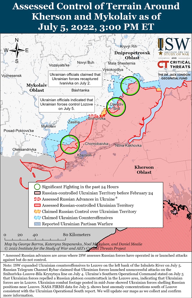 На південній ділянці фронту російська армія займалась утриманням оборонних рубежів і відбиттям українських контрнаступів. Оперативне командування «Південь» повідомило, що українські війська відбили атаку російського взводу поблизу Лозового (на південний захід від Давидового мосту в Херсонській області), що свідчить про те, що українські сили ймовірно, або відновили плацдарм у Лозовому, або постійно підтримували плацдарм, який вони створили на початку червня.