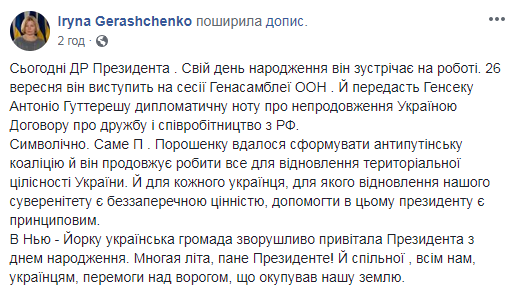 "26 вересня він виступить на сесії Генасамблеї ООН . Й передасть Генсеку Антоніо Гуттерешу дипломатичну ноту про непродовження Україною Договору про дружбу і співробітництво з Росією", - написала Геращенко.