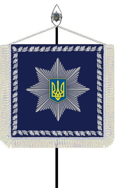 "Древко штандарта дерев'яне, чорного кольору висотою 250 см. Верхівка древка стріловидна з білого металу, в центрі якої вміщено рельєфне зображення емблеми Національної поліції України. Полотнище прикріплюється до основи верхівки древка за допомогою шнура, з'єднаного з дерев'яним стрижнем, вміщеним у верхньому краї полотнища. Підток древка – з білого металу у вигляді зрізаного конуса", - наголошується в описі.