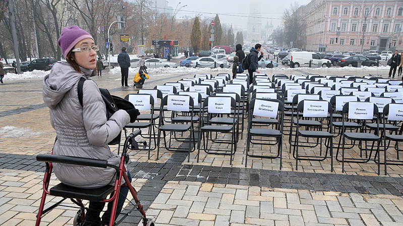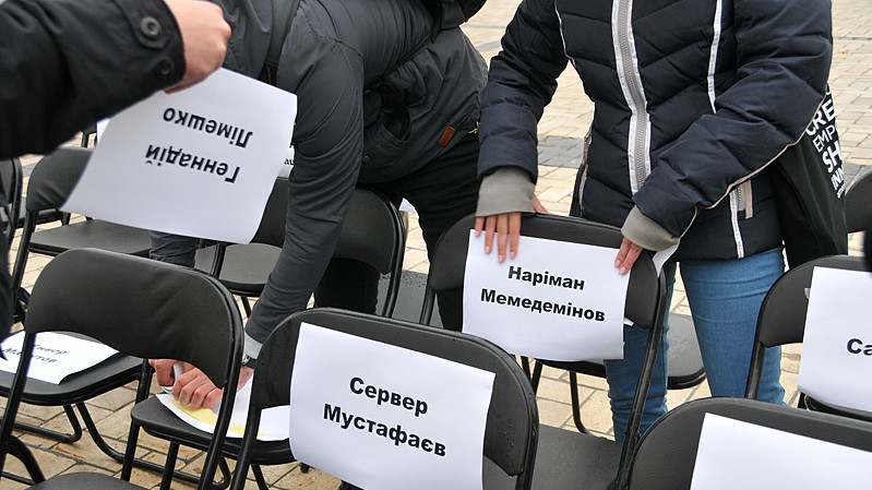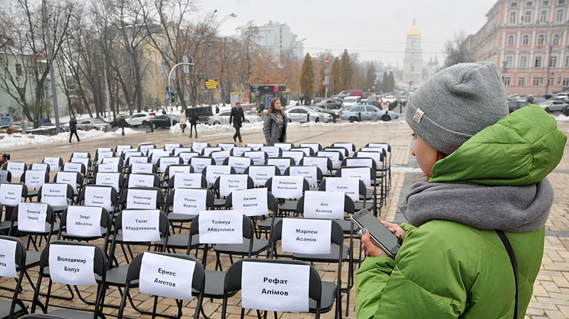 У Києві в четвер, 15 листопада, пройшла акція "Порожні стільці", присвячена українським політв'язням, утримуваним у Російській Федерації, окупованому Криму та в окремих районах Донецької і Луганської областей (ОРДЛО). На Михайлівській площі розмістили 100 стільців з іменами політичних в'язнів.