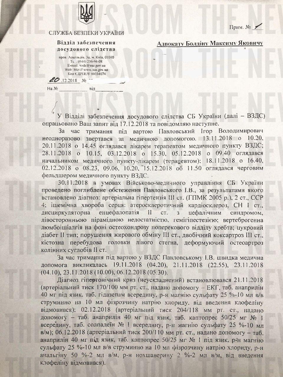 Згідно з документами, які опублікувало видання, Військово-медичне управління СБУ діагностувало у Павловського артеріальну гіпертензію третього ступеня, ішемічну хворобу серця , артосклеротичний кардіосклероз, діабет другого типу та інше. Також він не може пересуватися без сторонньої допомоги та без застосування милиць. За час триманні під вартою до Павловського щонайменше п'ять разів викликали швидку.