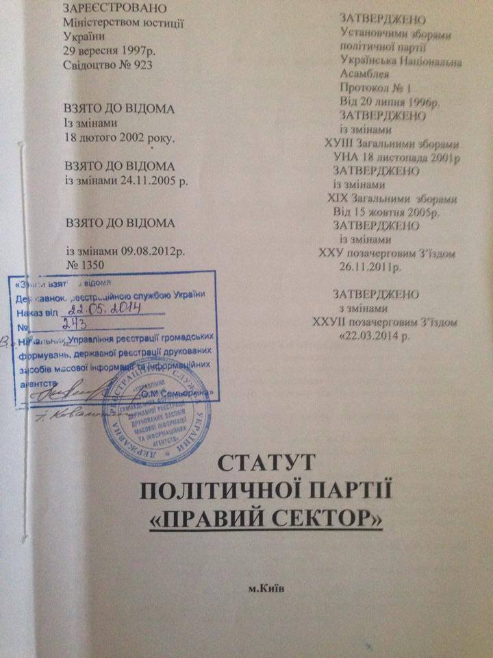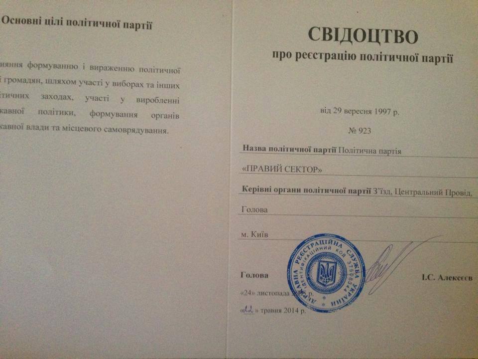 У викладених Березою документах зазначено, що свідоцтво про реєстрацію "Правого сектора" як партії видано 22 травня 2014 року, при цьому, в шапці свідоцтва зазначено 29 вересня 1997 року - тобто дата реєстрації в Мін'юсті України партії "Українська національна асамблея", яка на з'їзді 22 березня 2014 року вирішила перейменуватися в "Правий сектор". Свідоцтво підписано головою Укрдержреєстру Ігорем Алексєєвим.