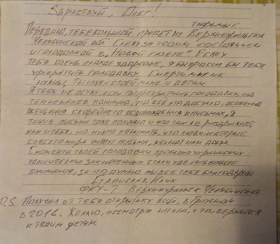 Передаю тобі великий привіт із в'язниці м. Верхньоуральска Челябінської обл. Стежу за твоїм станом і голодуванням у "Новій газеті". Якщо у тебе дуже погане здоров'я, я б просив тебе припинити голодування. Смерті ми не потрібні, ти потрібен своїй мамі та дітям. Я тебе не засуджуватиму, якщо ти припиниш голодування, але, тим не менше, розумію, що все це дістало, особливо обіцянки якнайшвидшого звільнення в листах, я такі листи теж отримую і це так само дратує, як і тебе, але потрібно розуміти, що люди, які зы всього світу пишуть листи, бажають нам добра. З моменту твого голодування проблемі українських політв'язнів стали приділяти більше уваги, за це, думаю, ми всі тобі вдячні.