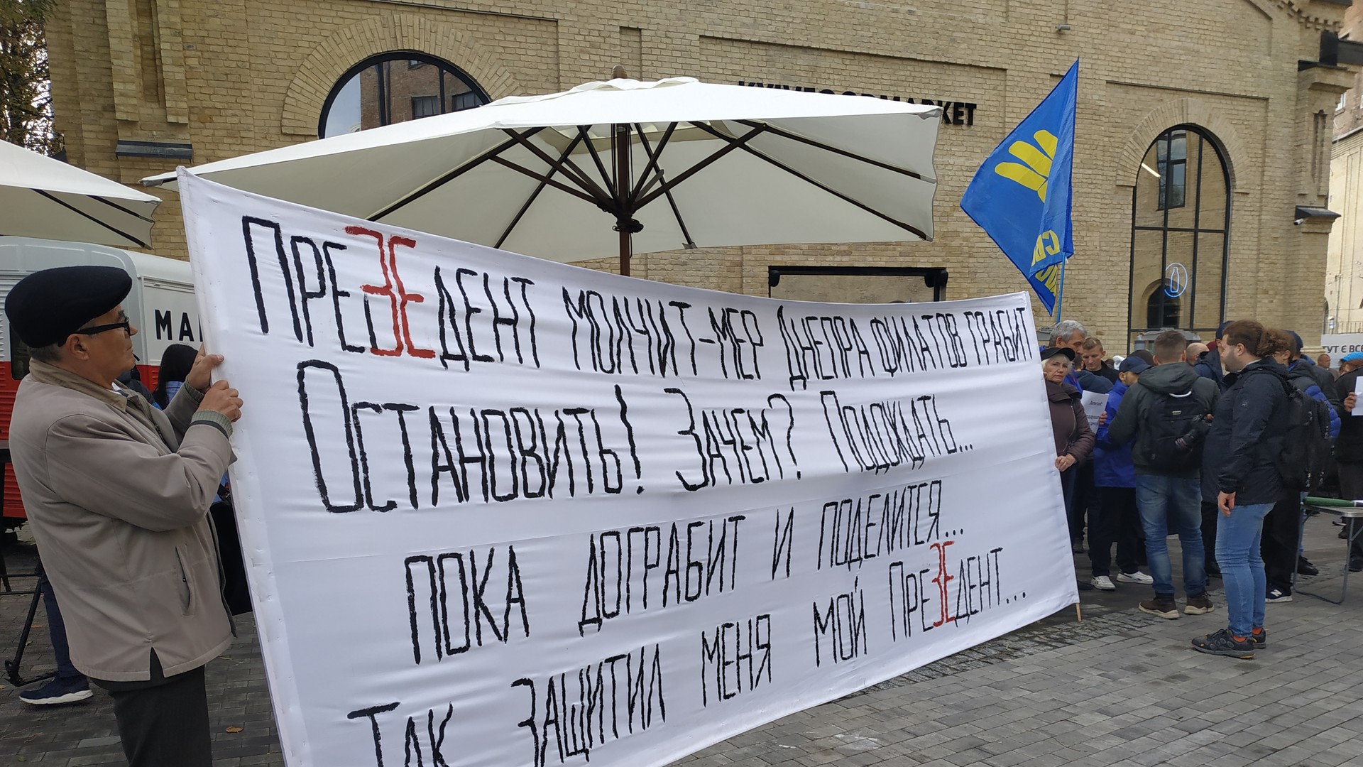 У Києві зараз відбувається кілька акцій протесту під будівлею Kyiv Food Market, де почався пресмарафон за участю президента Володимира Зеленського та акредитованих журналістів.