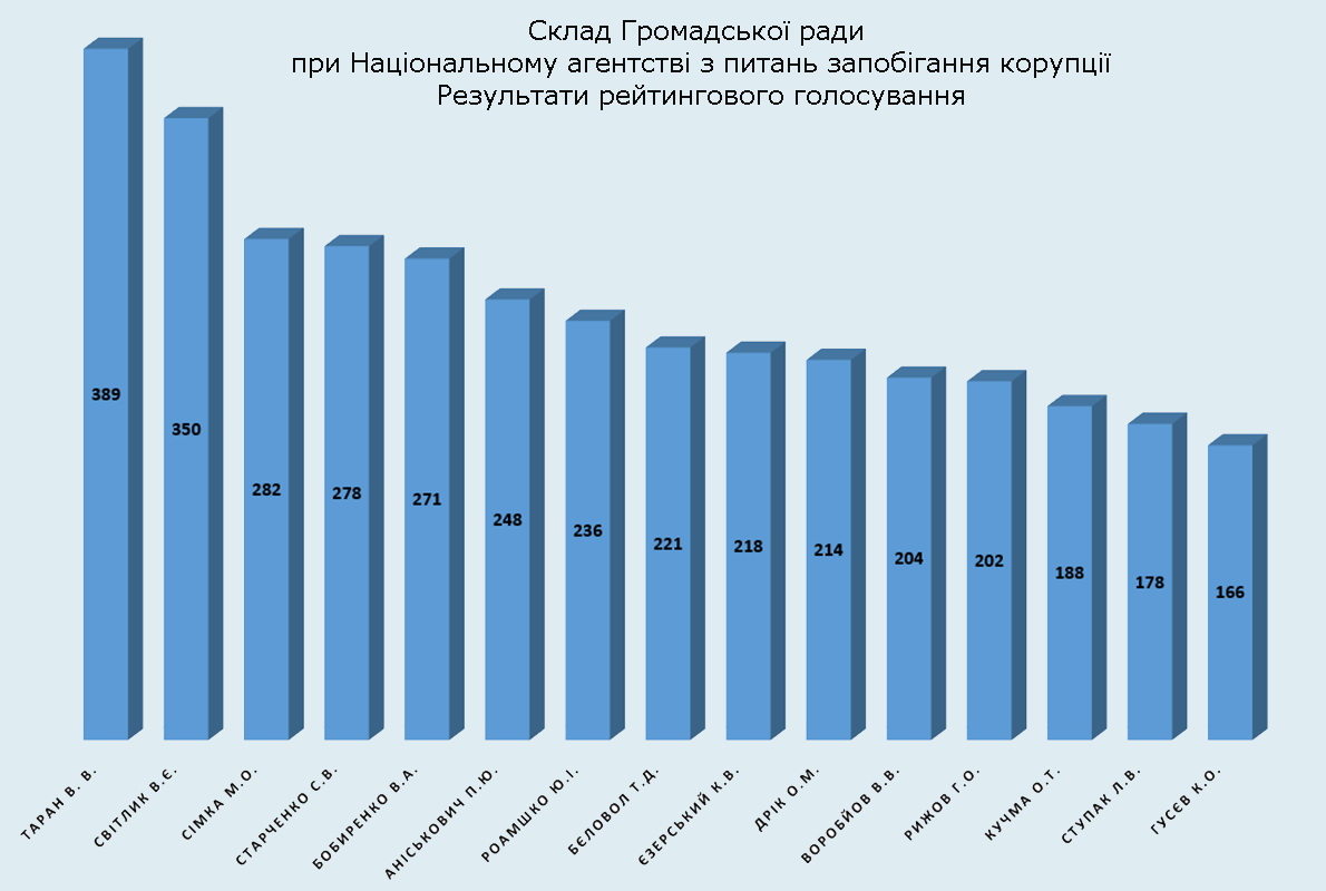Як повідомляється на сайті НАЗК, шляхом рейтингового голосування обрано 15 кандидатів із 44, запропонованих громадськими об'єднаннями.