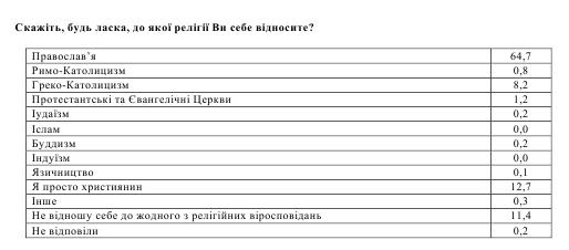 Із усіх опитаних греко-католиками вважають себе 8,2%; 1,2% - протестантами, а 0,8% - римо-католиками, 12,7% опитаних ідентифікують себе як "просто християни", 0,2% респондентів сповідують іудаїзм, 0,2% - буддизм, 0,1% - язичництво, 0,3% є прихильниками якогось іншого культу.
