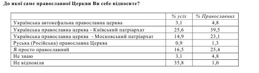 Найбільша кількість православних (39,5%) ідентифікують себе з УПЦ Київського патріархату. Друга за кількістю група (25,4%) вважає себе "просто православними", 23,3% відносять себе до УПЦ Московського патріархату.