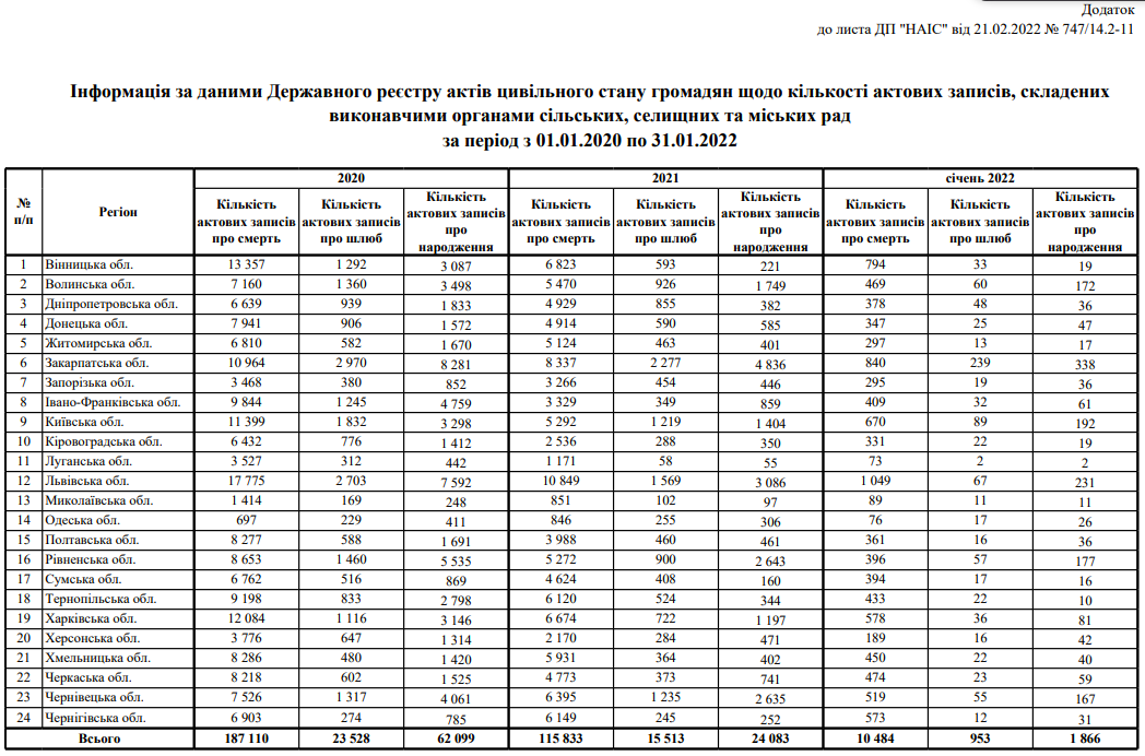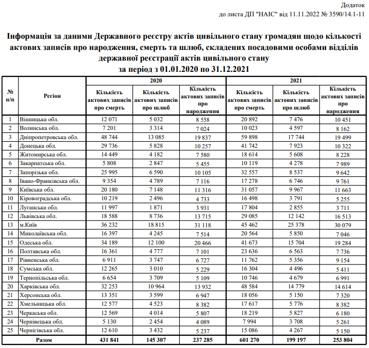 У 2021 році зареєстровано понад 717 тисяч смертей. Виконавчі органи місцевих рад у 2021 році склали на 71 тисячу актових записів менше, ніж у 2020-му. Натомість підрозділи Мін’юсту склали таких реєстрацій на майже 170 тисяч більше. Порівняно з 2020 роком, динаміка змінилася майже вдвічі й становить понад 1 до 5 на користь Мін’юсту.