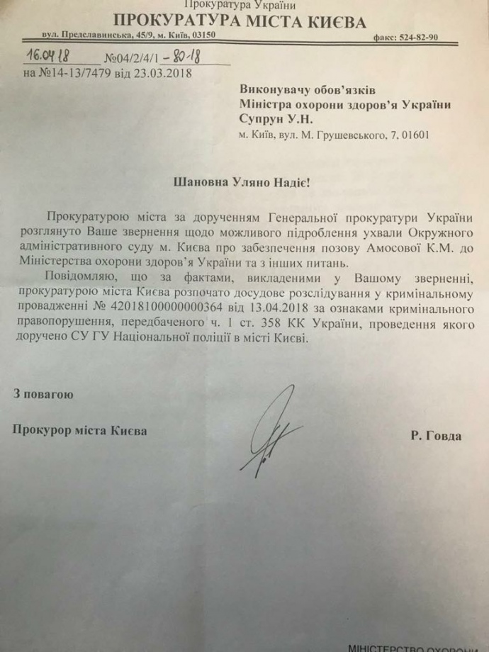 Прокуратура міста Києва розпочала досудове розслідування щодо можливої підробки ухвали Окружного адміністративного суду р. Києва про забезпечення позову Катерини Амосової у Міністерство охорони здоров'я, повідомляється на сайті Міністерства охорони здоров'я.