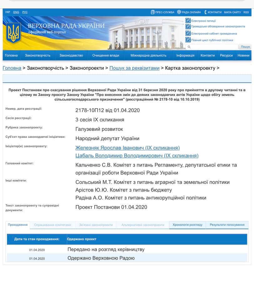 Враховуючи викладене, представляється необхідним скасувати результати голосування, щоб в подальшому ще більше народних депутатів змогли проголосувати за вказаний законопроект. Це дозволить продемонструвати, що в парламенті значно більше, ніж 259 народних депутатів, не є популістами в питанні відкриття вільного обігу земель сільськогосподарського призначення".