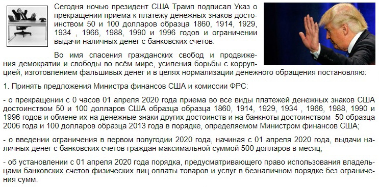 Певний резонанс у соціальних мережах викликала жартівлива новина про начебто ініційовану Дональдом Трампом грошову реформу, що передбачає виведення з обігу банкнот номіналом 50 і 100 доларів. Цю новину розмістив один з російських ресурсів. Основою для фейку стл реальний указ президента СРСР Михайла Горбачова від 22 січня 1991 року про виведення з обігу "п'ятдесяток" і "сторублівок" зразка 1961 року й обмеження видачі готівкових грошей з ощадних вкладів громадян.