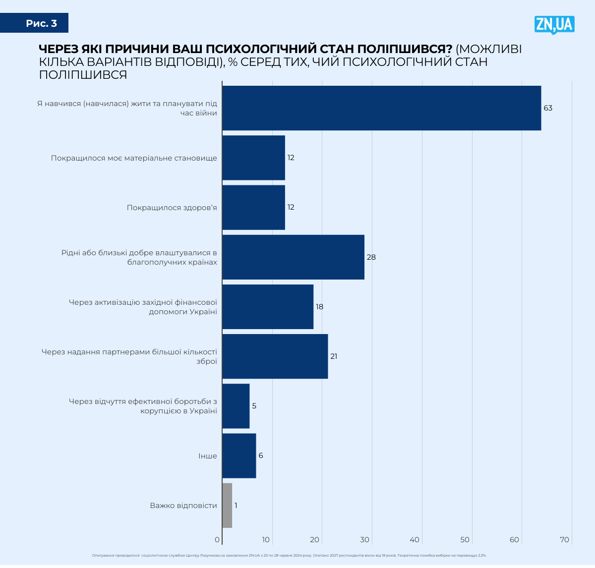 Відповіді на опитування свідчать про те, що добробут сім’ї вкрай важливий для нас. Серед причин поліпшення стану українців «інформація про те, що рідні або близькі добре влаштувалися в благополучних країнах», — другий за важливістю чинник зменшення стресу (28,4%).
