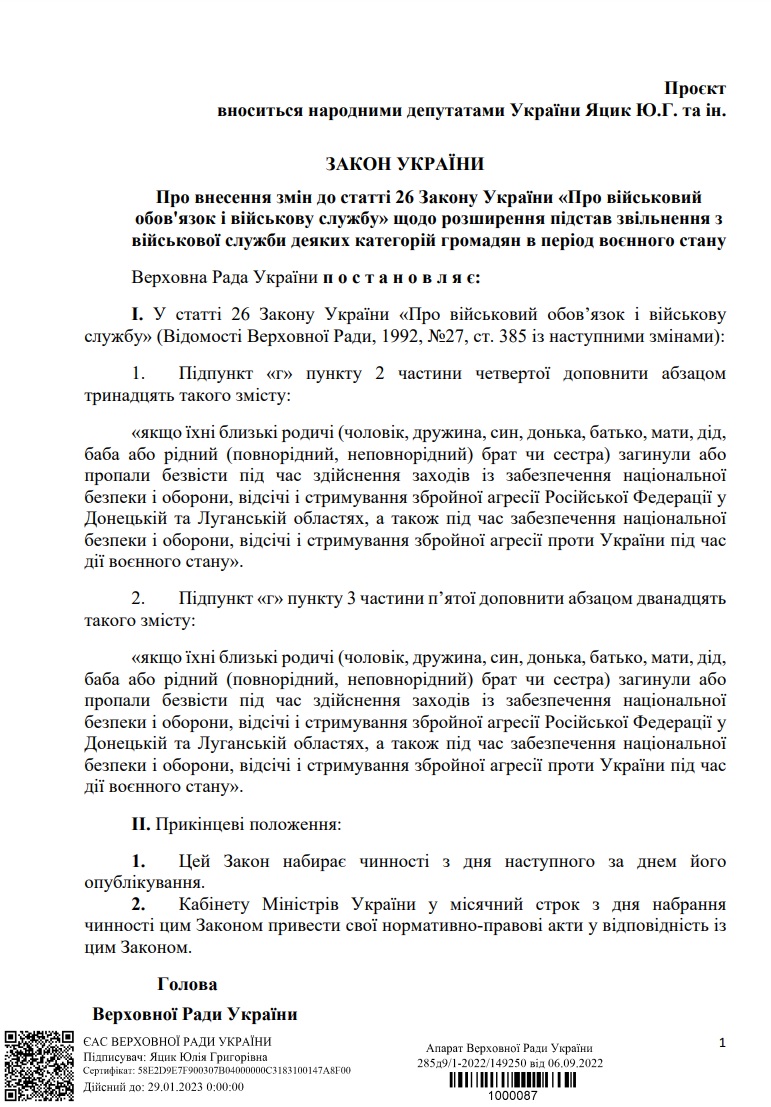 Раніше парламентом було ухвалено законопроєкт, який передбачає, що не підлягають призову особи, близькі яких загинули чи пропали безвісти під час російсько-української війни. Однак він не врахував інтереси тих, хто вже знаходився на службі.