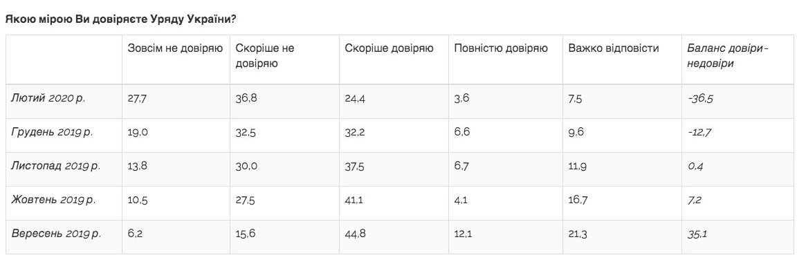 Однак у лютому 2020 року повністю підтримують діяльність уряду 6% респондентів, підтримують окремі заходи - 34%, не підтримують - 51%. Діяльність прем'єр-міністра Олексія Гончарука повністю підтримують 6%, підтримують окремі заходи - 29,5%, не підтримують - 52%.