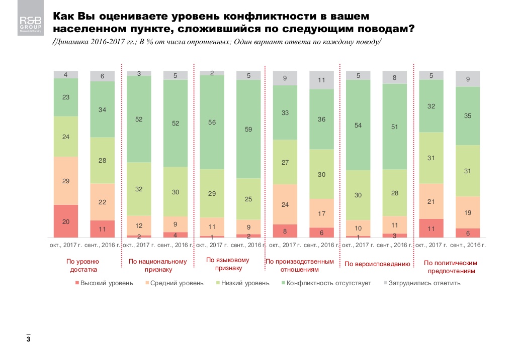 При цьому назвали високий рівень конфліктності за національною ознакою 2% респондентів, за мовною ознакою – 1%, за релігійною – 1%.