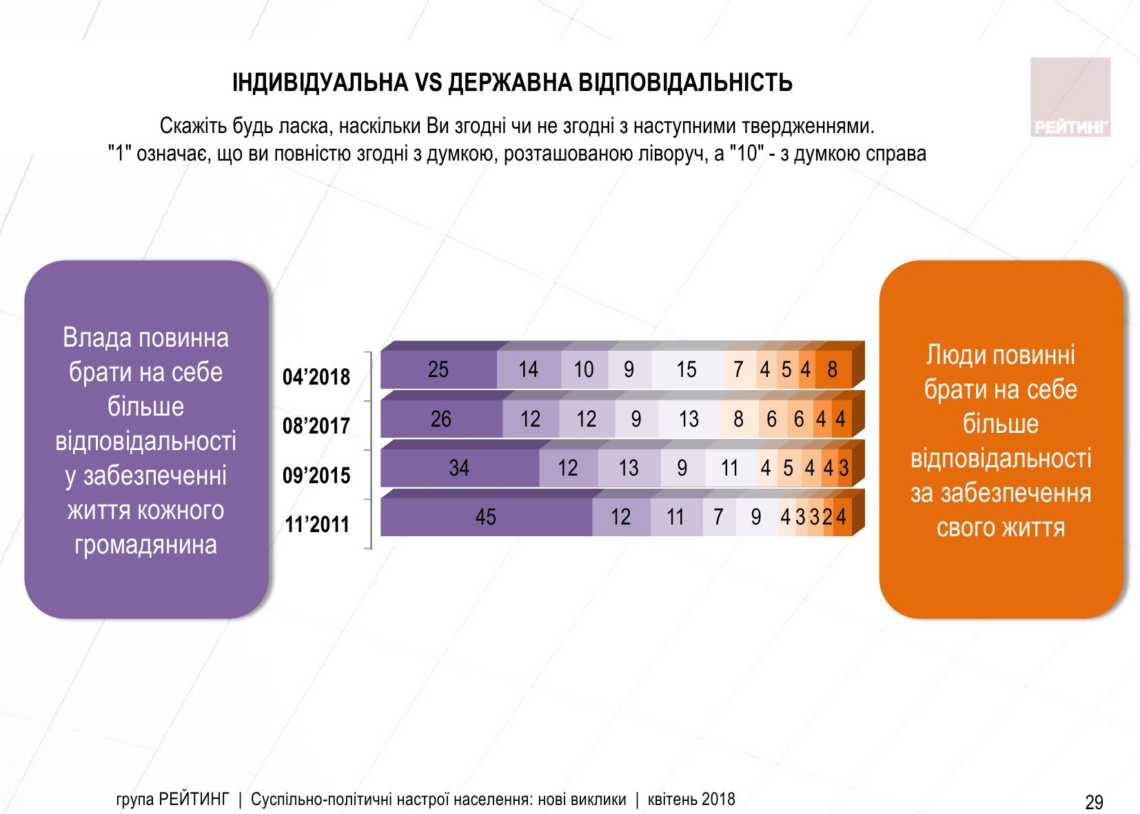 Як зазначають соціологи, якщо в 2011 році майже 80% респондентів вважали, що саме влада повинна брати на себе відповідальність у забезпеченні життя кожного громадянина, то в квітні 2018 року таких опитаних менше 60%.