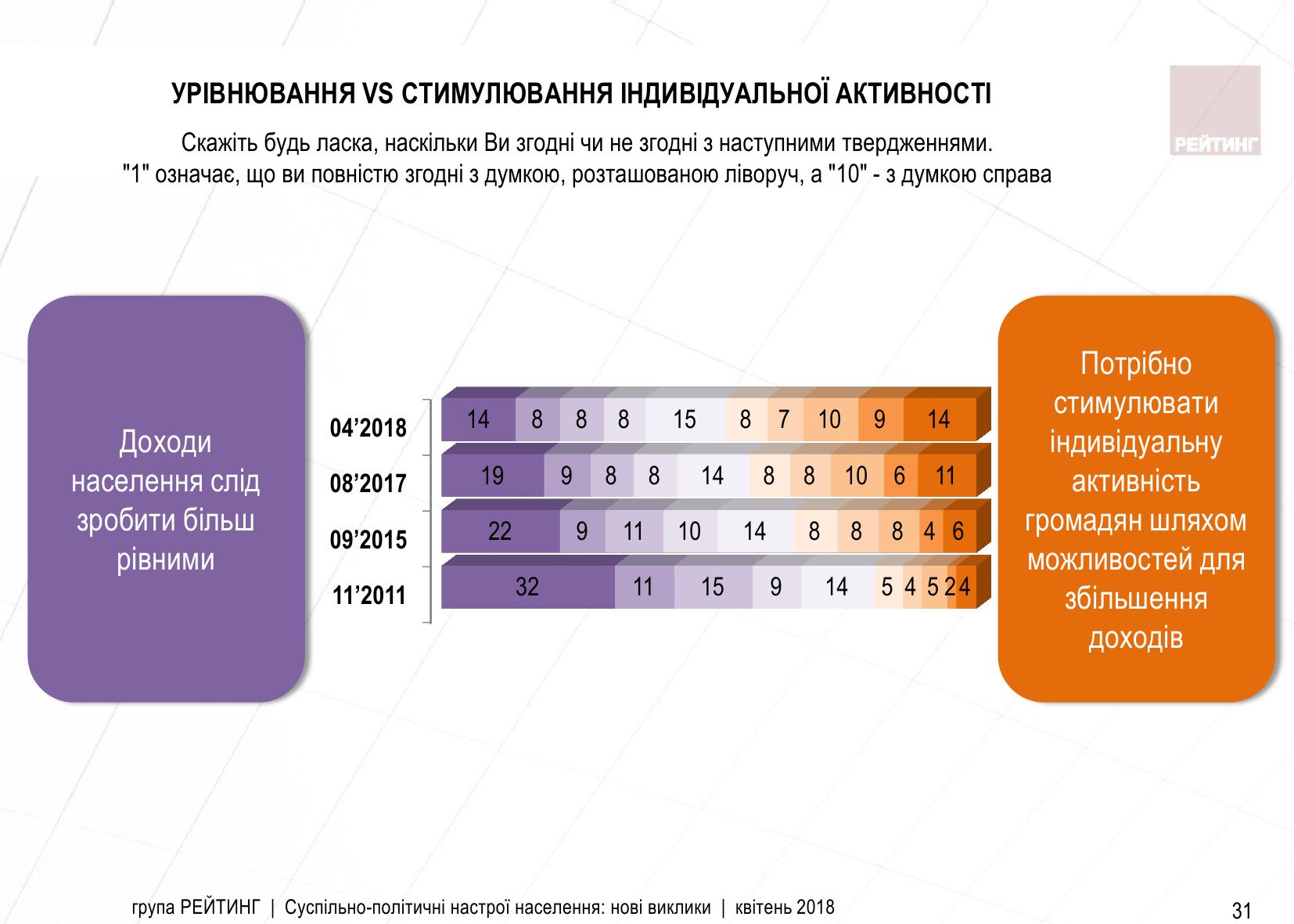 Аналогічно змінюються погляди про необхідність "вирівнювання" доходів. Сім років тому майже 70% підтримували подібні ініціативи, сьогодні таких удвічі менше. Натомість зростає підтримка тези, що потрібно стимулювати індивідуальну активність громадян шляхом можливостей для збільшення доходів.
